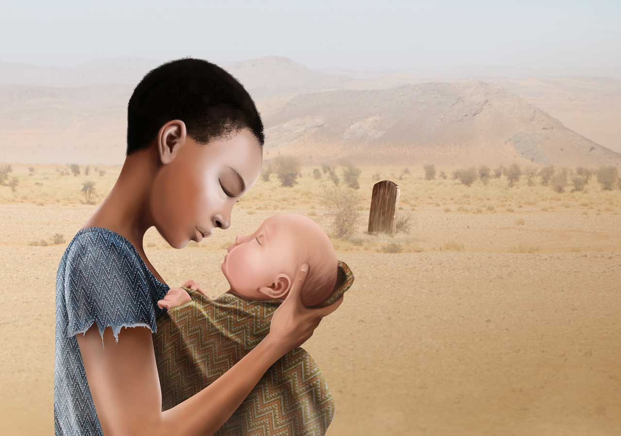The author was quite specific in his project brief. He wanted an illustration featuring a young girl of Cape-Coloured origin holding a baby.