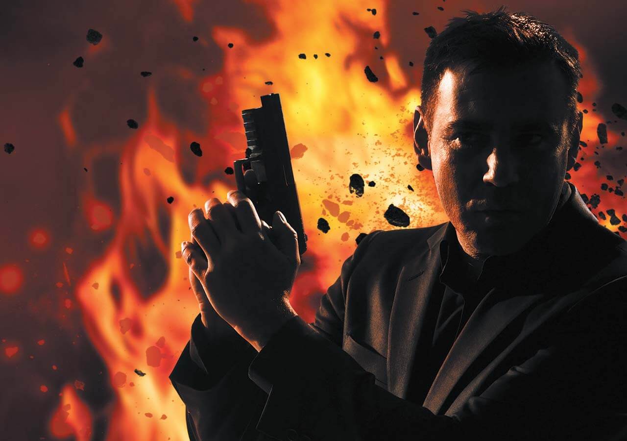 Featuring an MI5 special agent, The image was created using a stock photograph with the explosion and lighting added in photoshop.