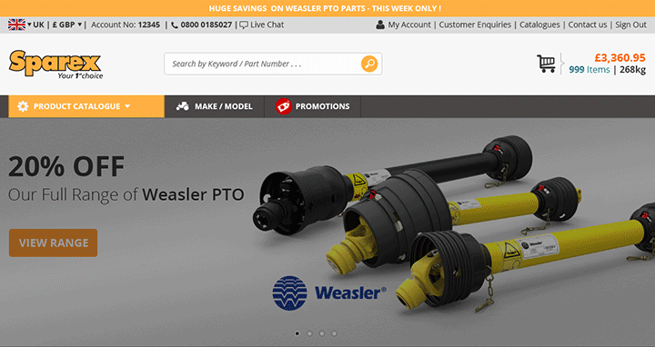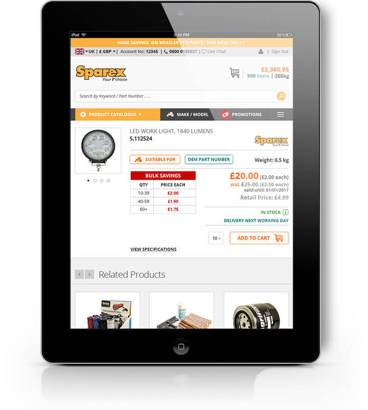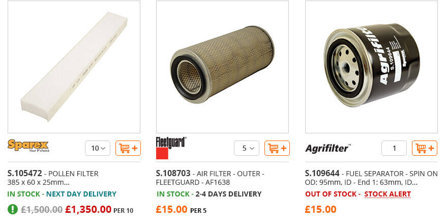 The product grid also presented a challenge as Sparex wanted to display a large amount of information including brand logos, minimum order quantity, stock messages, delivery information and pricing.